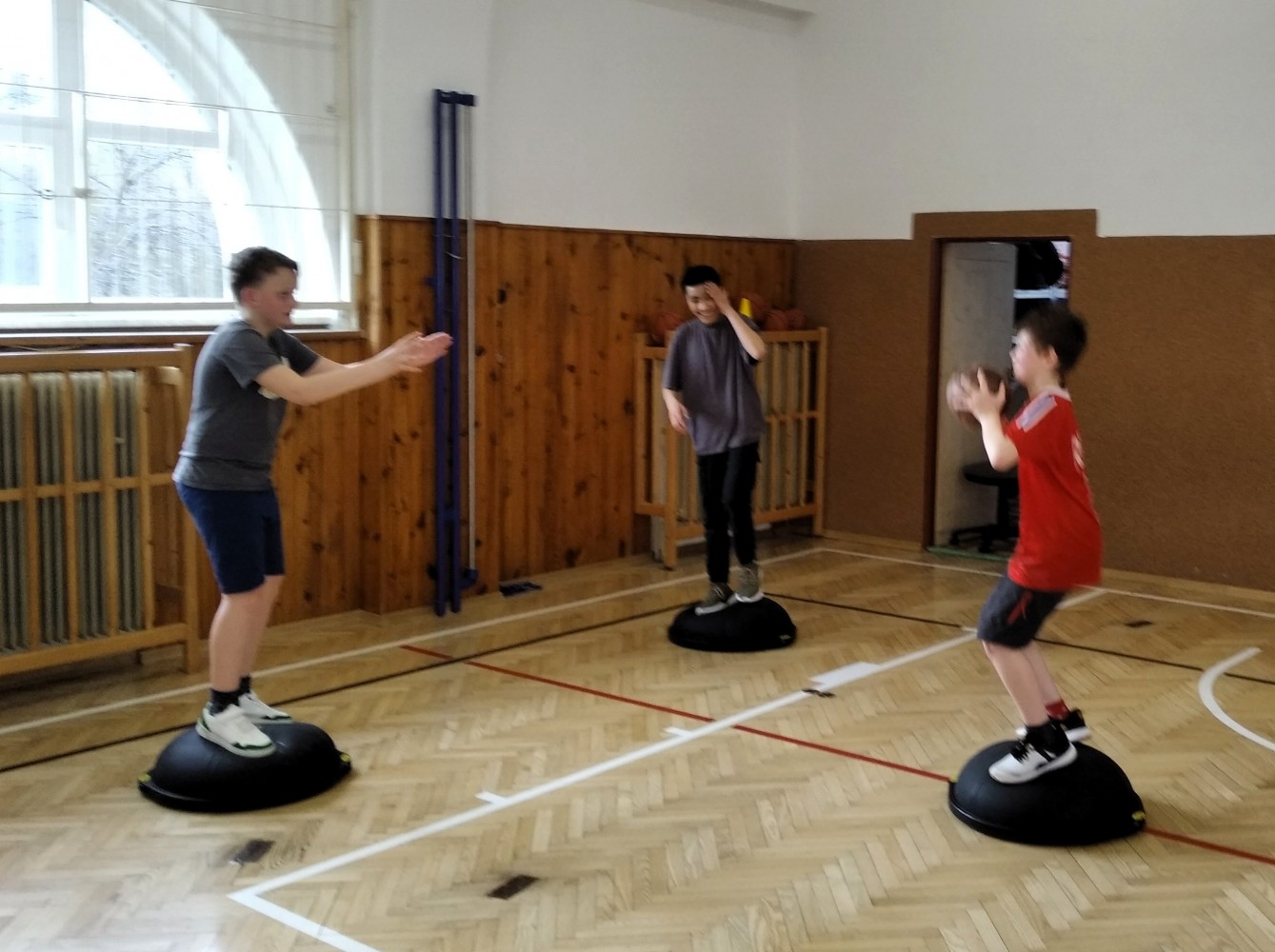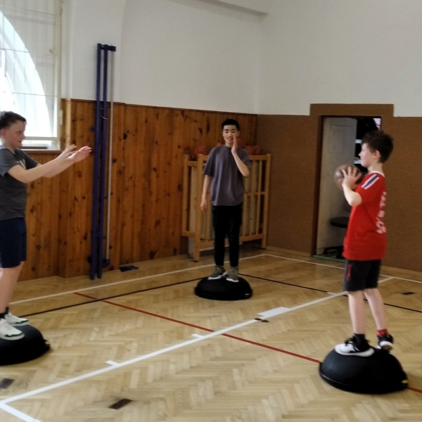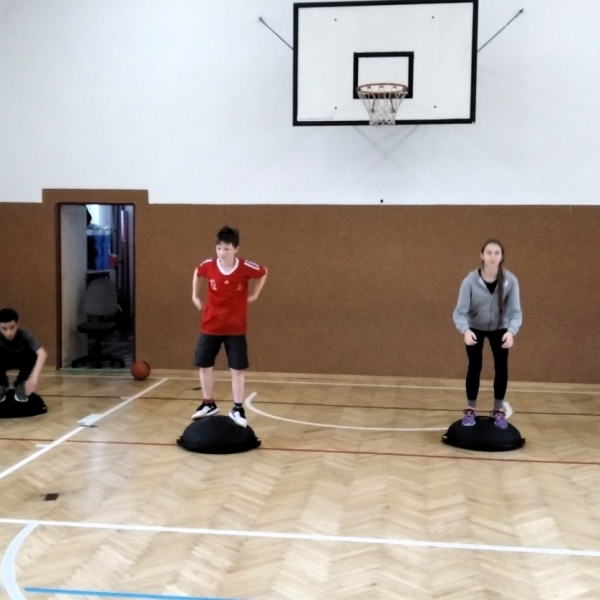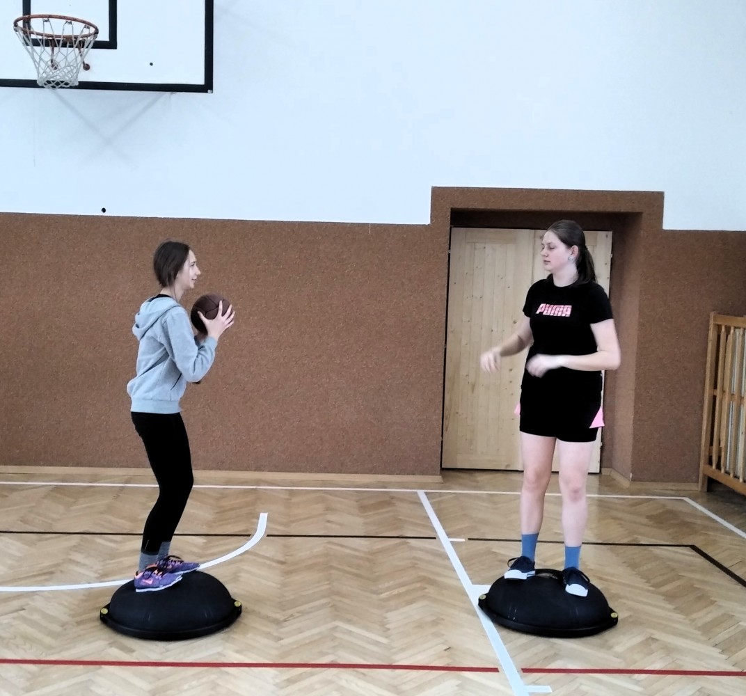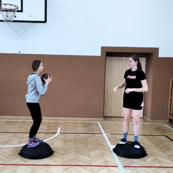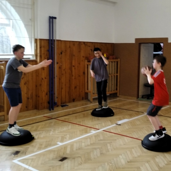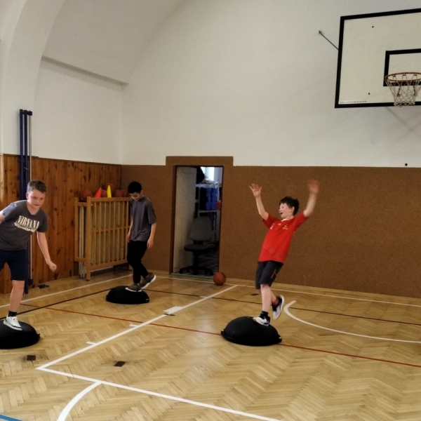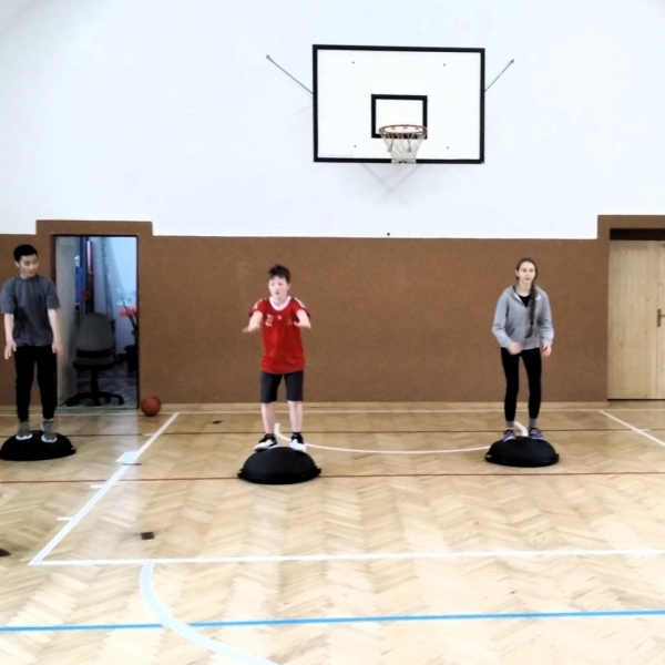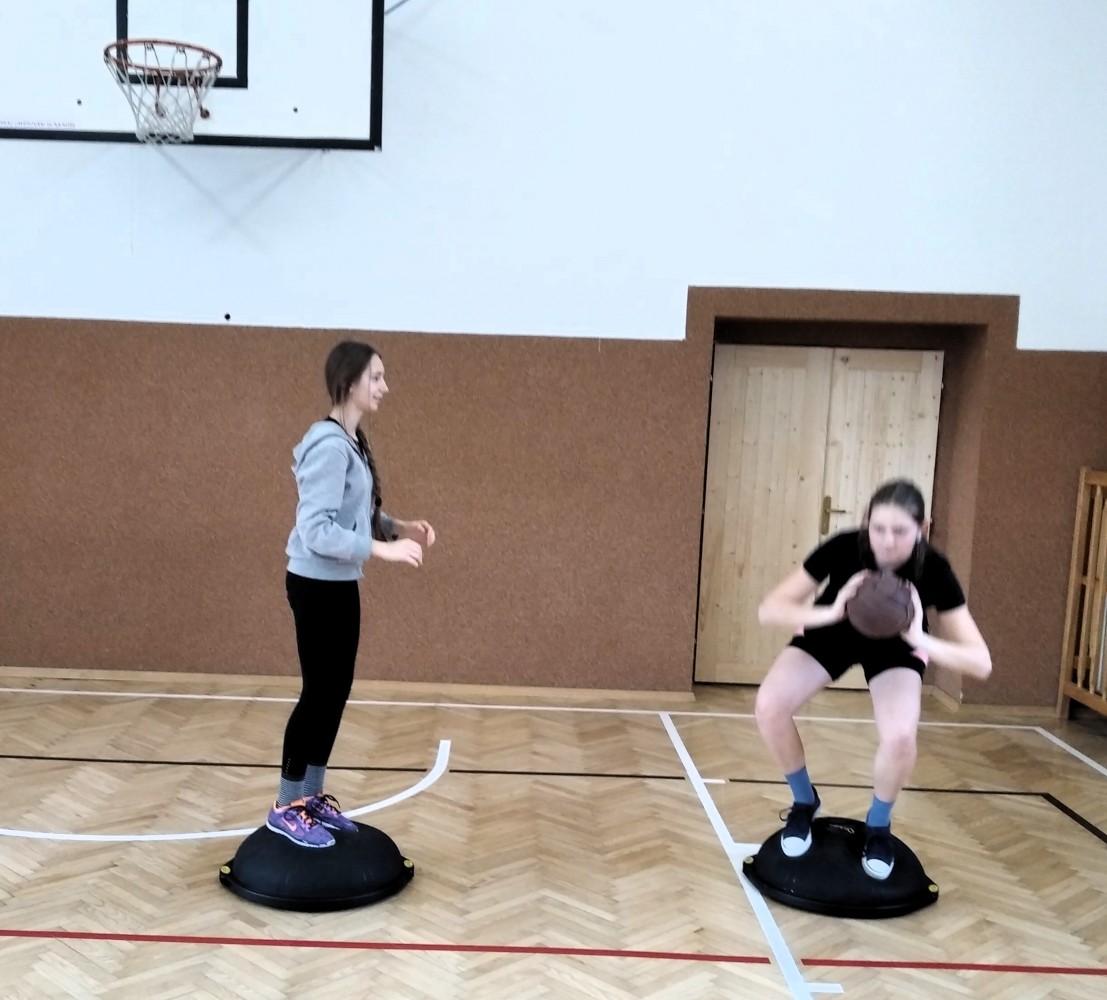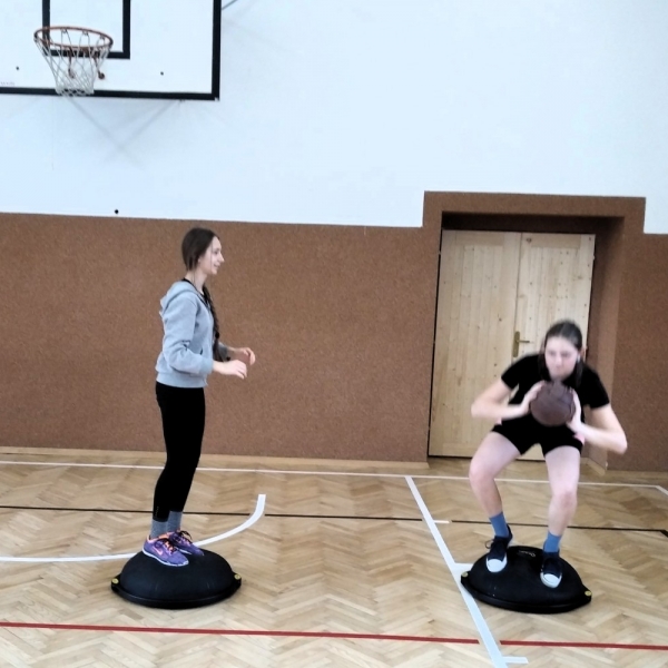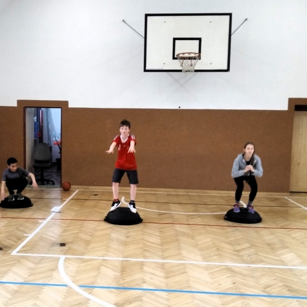 Ve fotopříloze najdete kromě fotografií z nácviku změn směru driblinkového pohybu i fotografie z nácviku dvojtaktů a cvičení rovnováhy na balančních podložkách.