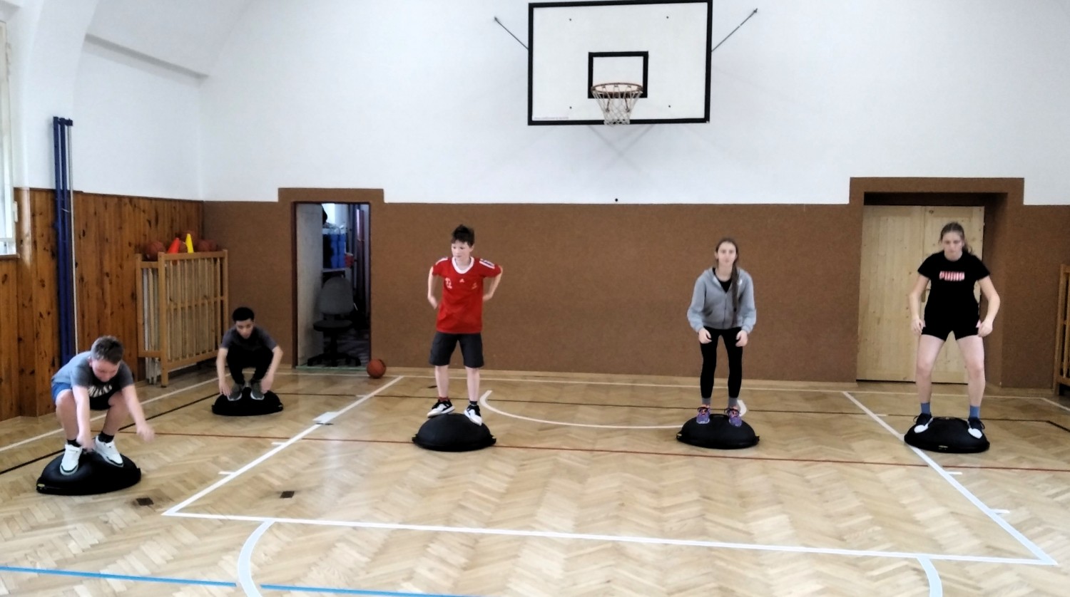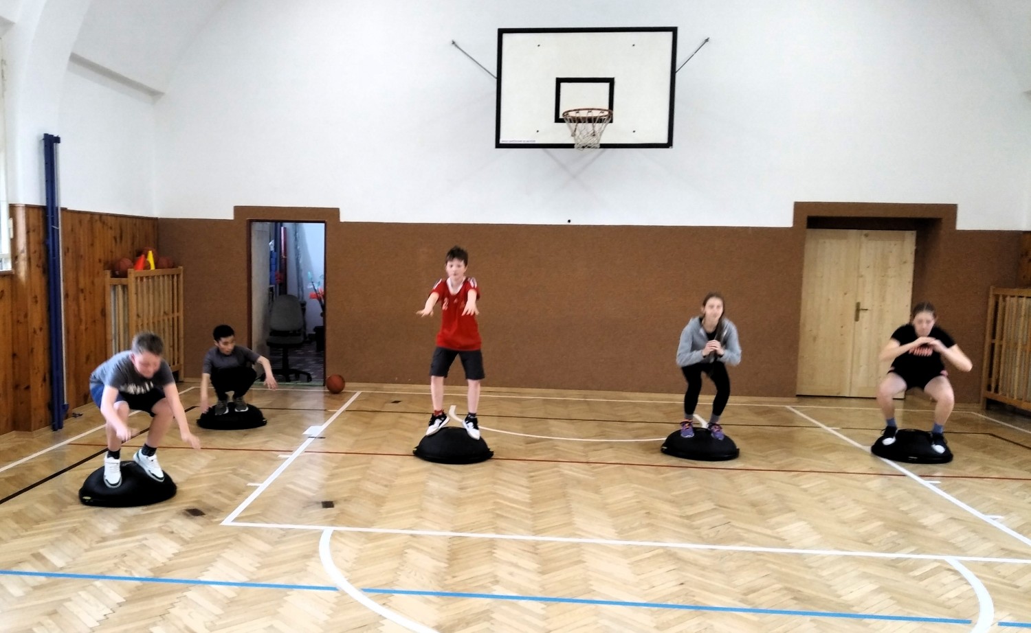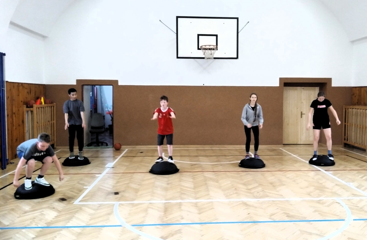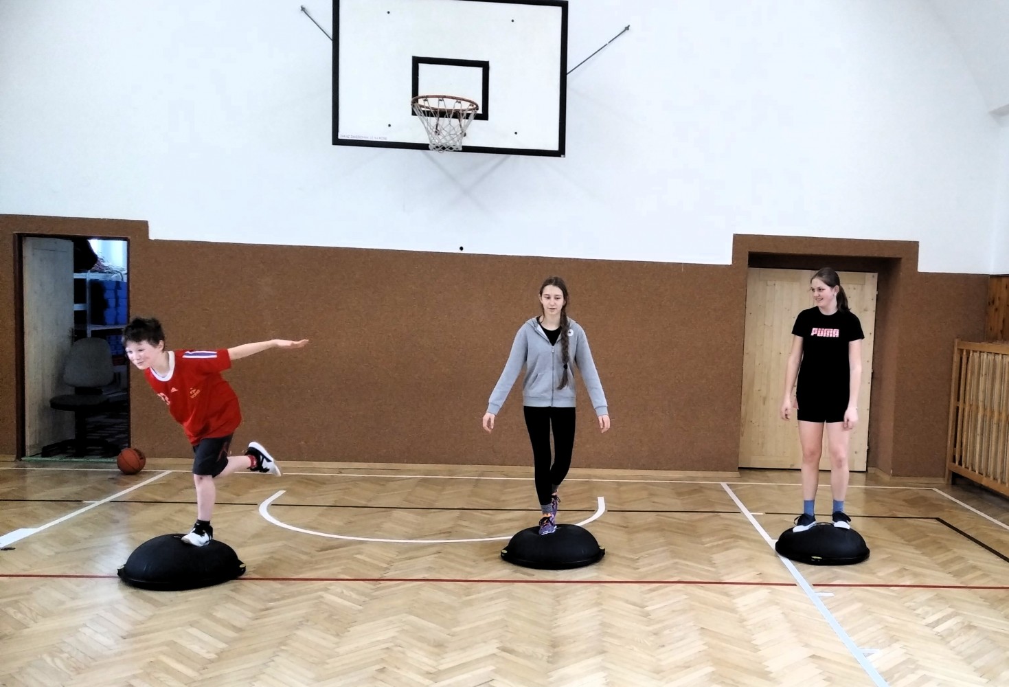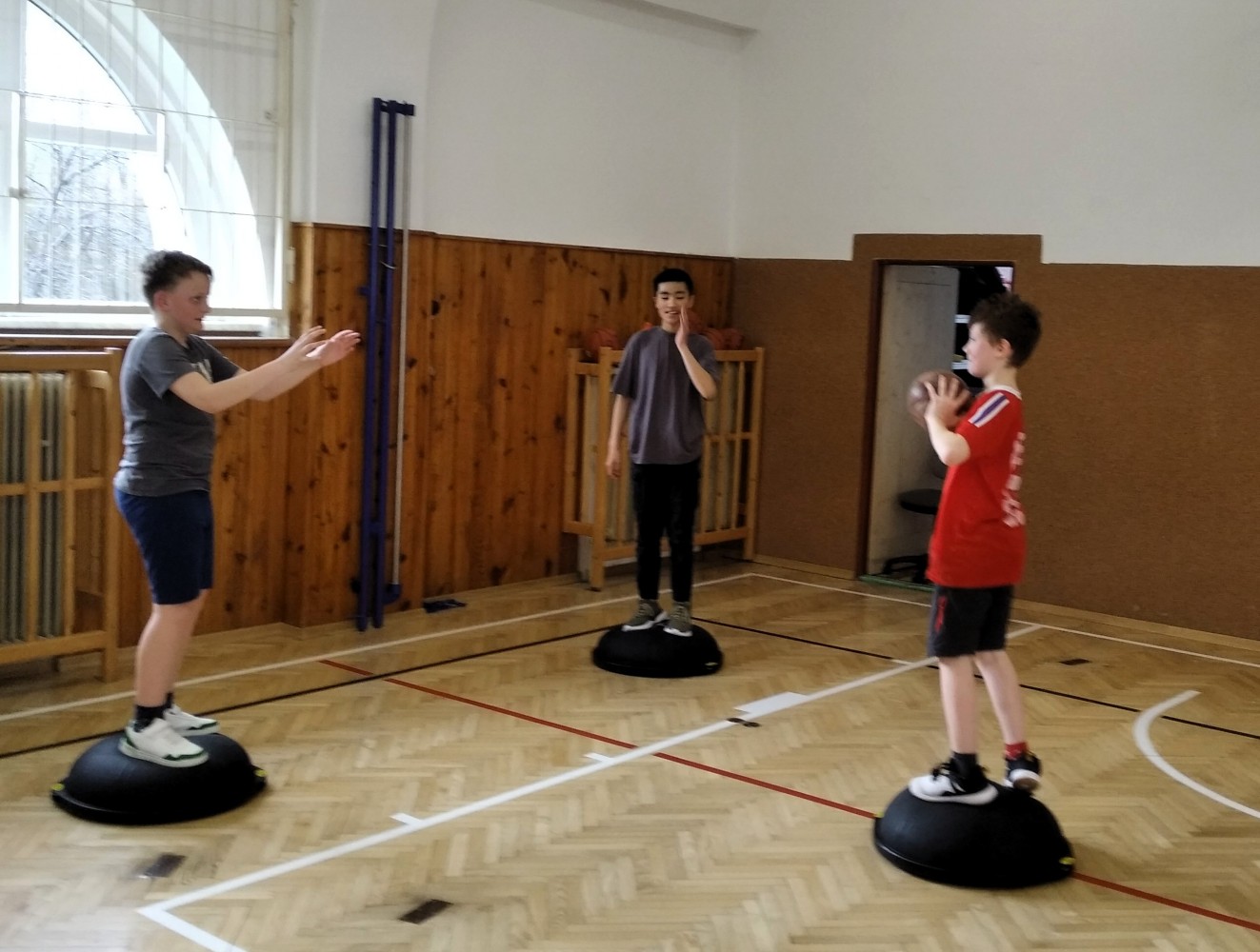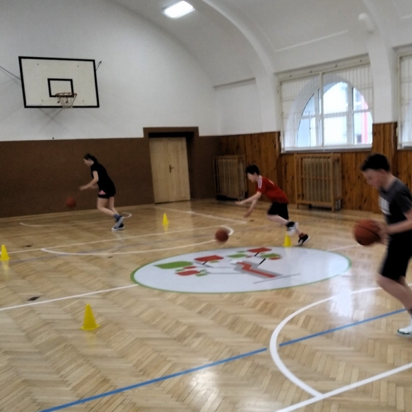 Ve fotopříloze najdete kromě fotografií z nácviku změn směru driblinkového pohybu i fotografie z nácviku dvojtaktů a cvičení rovnováhy na balančních podložkách.