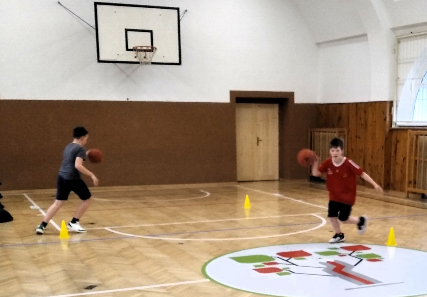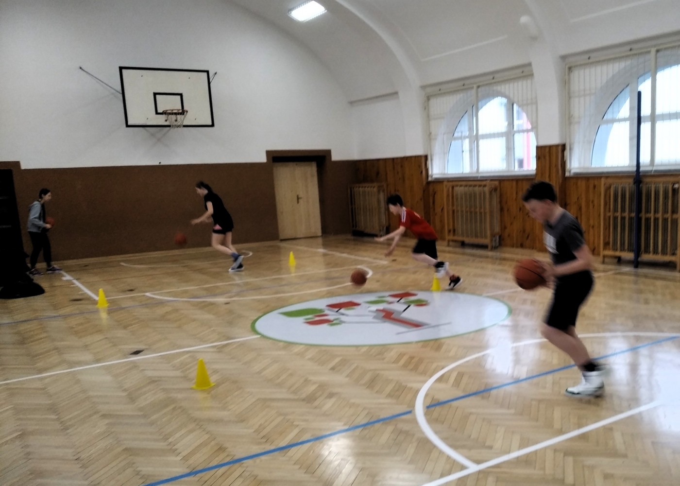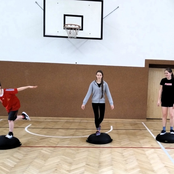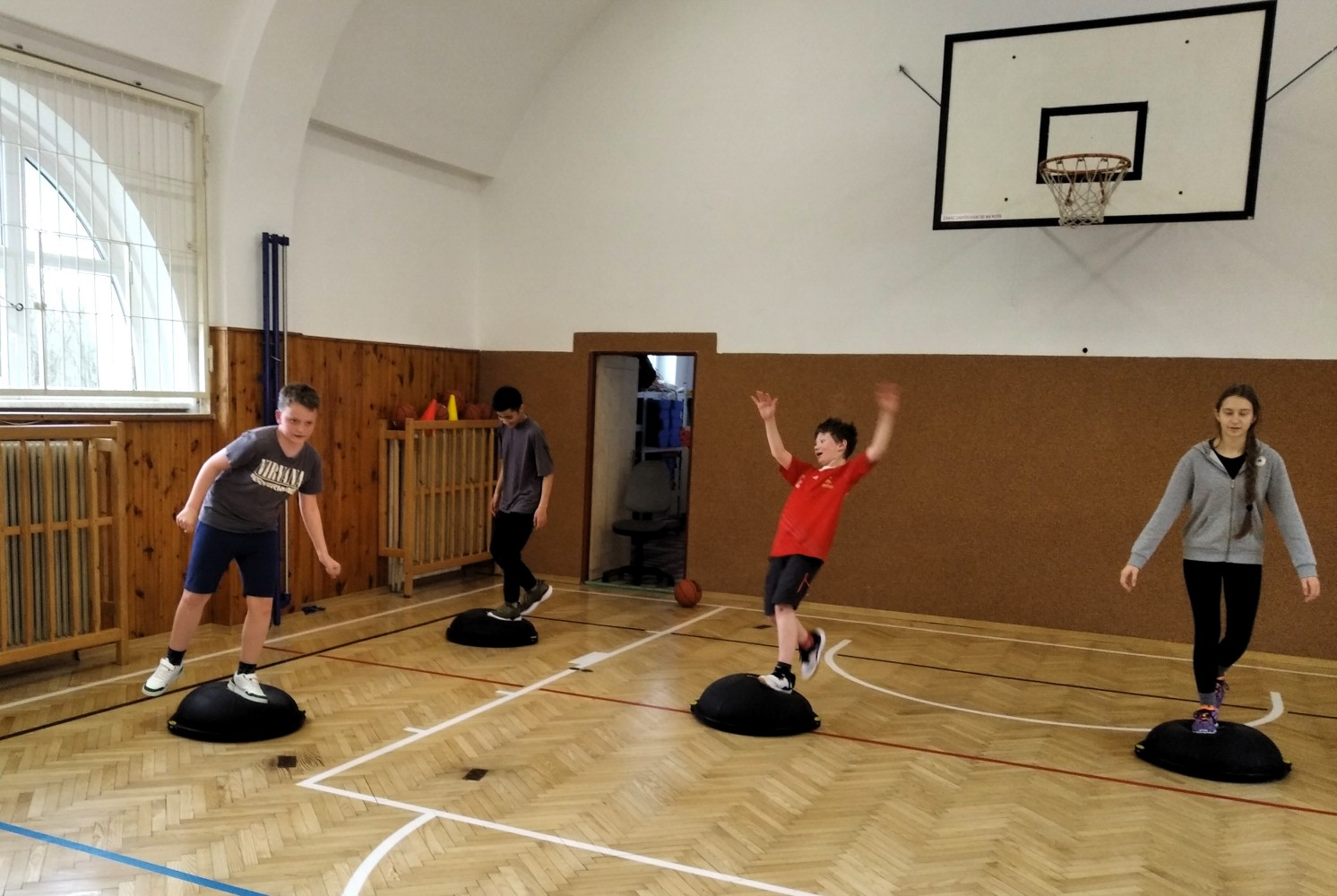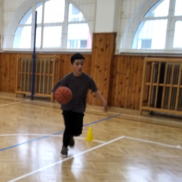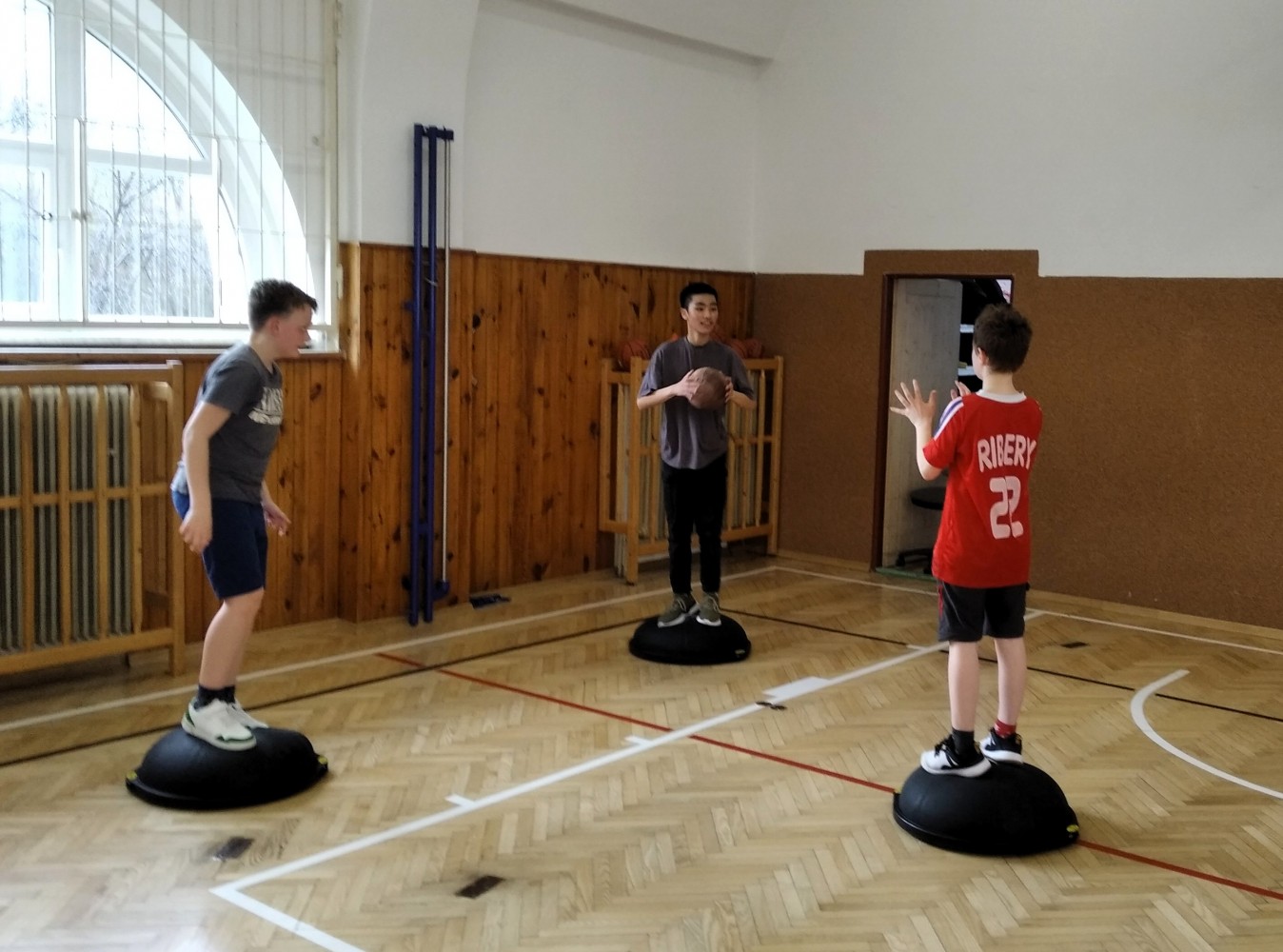 Ve fotopříloze najdete kromě fotografií z nácviku změn směru driblinkového pohybu i fotografie z nácviku dvojtaktů a cvičení rovnováhy na balančních podložkách.