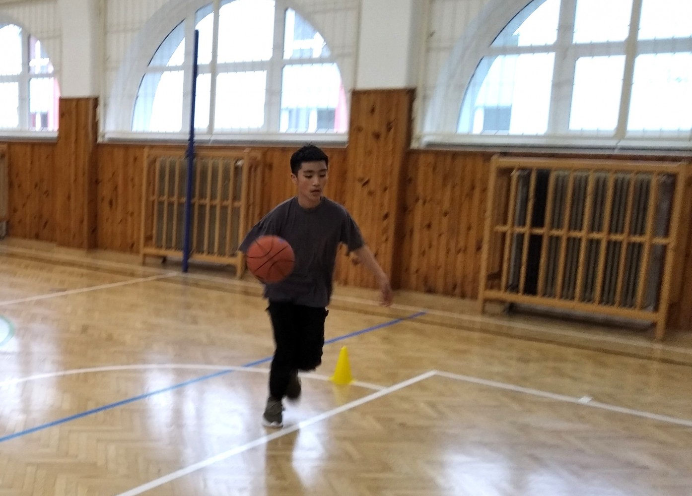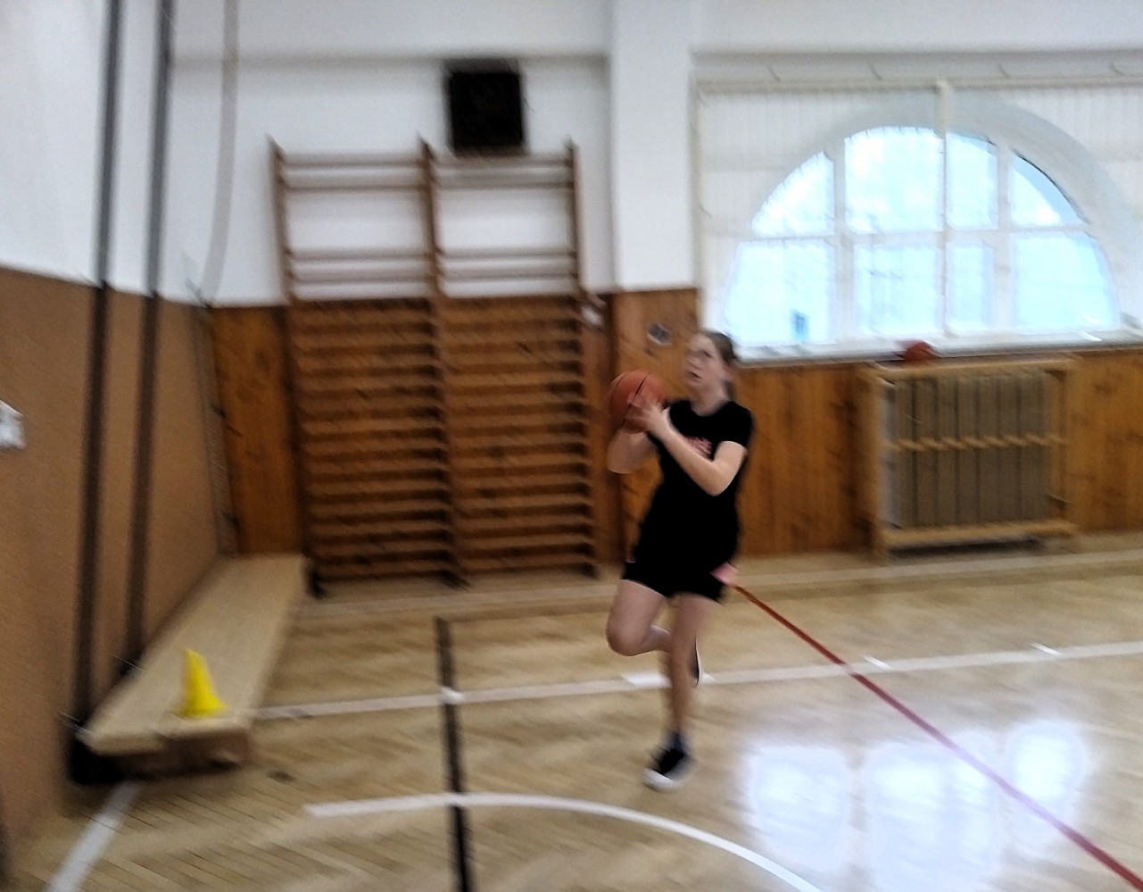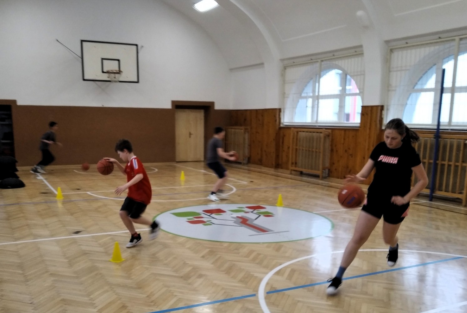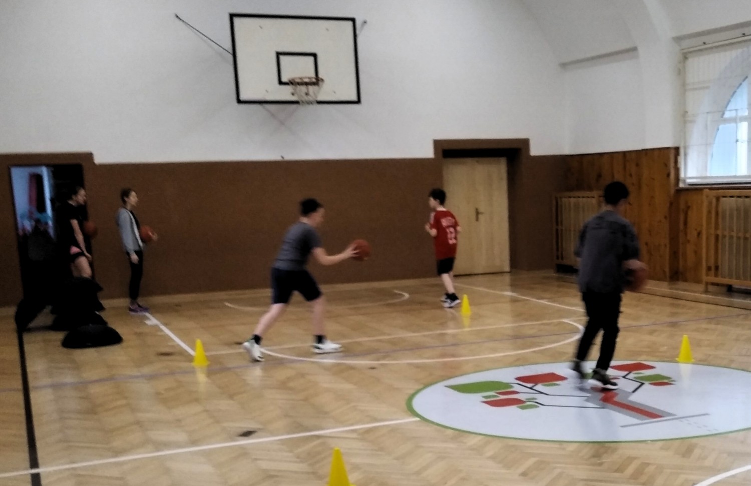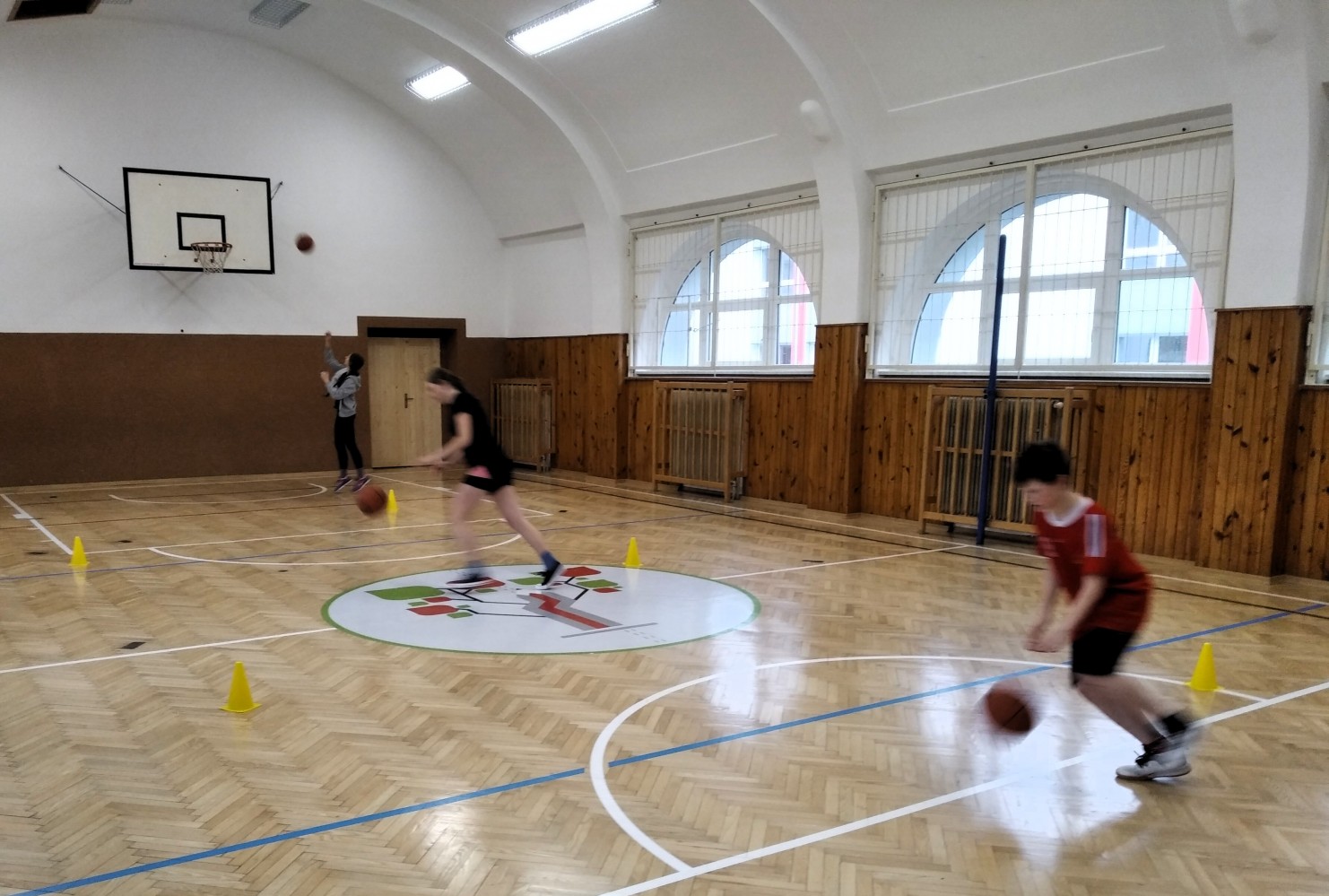 Ve fotopříloze najdete kromě fotografií z nácviku změn směru driblinkového pohybu i fotografie z nácviku dvojtaktů a cvičení rovnováhy na balančních podložkách.